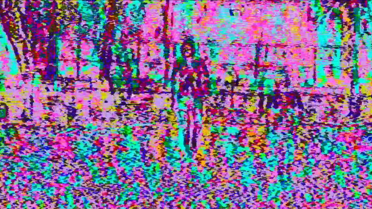 Une série d’images déformées trouvent un nouveau sens. La composition d’espace publics, matériau constamment en mouvement, est reconfigurée au profit de motifs abstraits aux couleurs vives, résidus de l’altération digitale. Les individus apparaissent comme des fantômes, toujours visibles mais traversant le cadre avec ou sans but. Un homme se détache de son environnement par le mouvement, vers la caméra, comme une affirmation de sa présence à l’écran. Des coupures dans le temps ramènent les images à un état hybride, entre la prise initiale et l’altération, comme un seuil qui ne peut qu’entraîner leur fin.